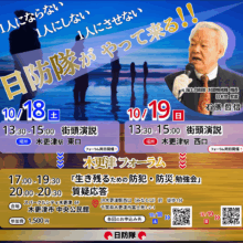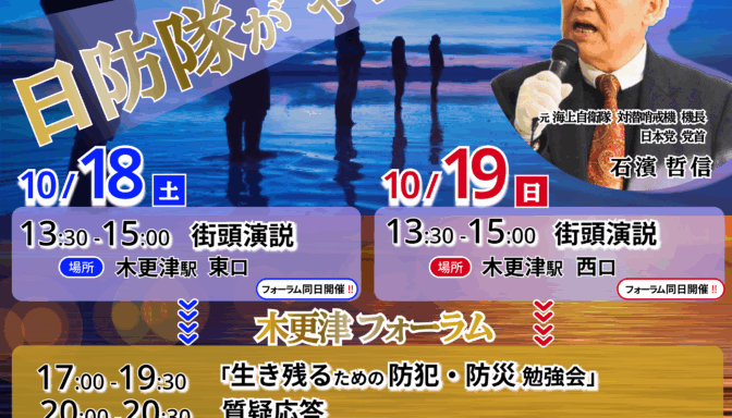 | 11:30~13:00:街頭演説 @ 高崎駅西口 15:00~16:30 :群馬フォーラム 「生き残るための勉強会」 会場:高崎白銀ビル(参加費 1,500円) 17:00~18:30 :日本党/日防隊 の入党/入隊説明会 |