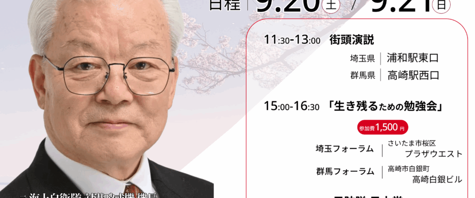 | 13:30~15:00:街頭演説 @ 木更津駅西口 17:00~19:30 :木更津フォーラム 「生き残るための 防犯・防災 勉強会」 会場:木更津市中央公民館(参加費 1,500円) 20:00~20:30 :質疑応答 |