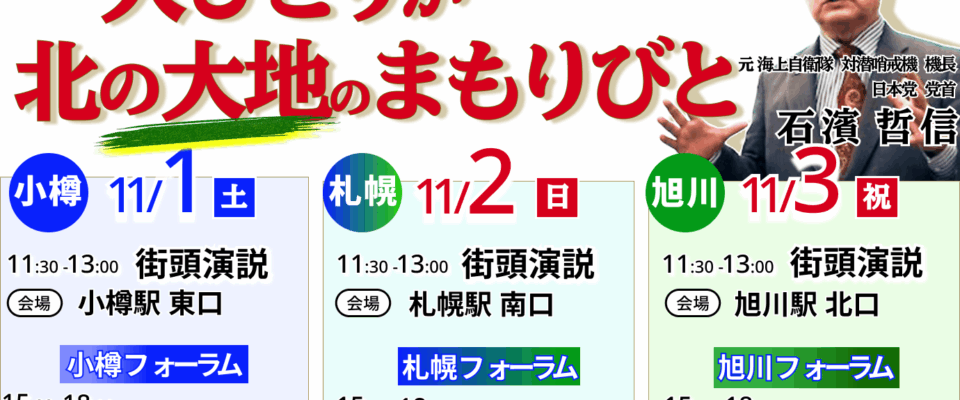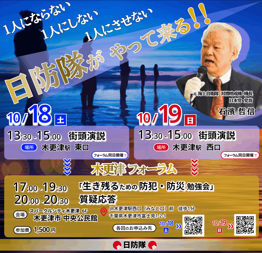 | 13:30~15:00:街頭演説 @ 木更津駅東口 17:00~19:30 :木更津フォーラム 「生き残るための 防犯・防災 勉強会」 会場:木更津市中央公民館(参加費 1,500円) 20:00~20:30 :質疑応答 |